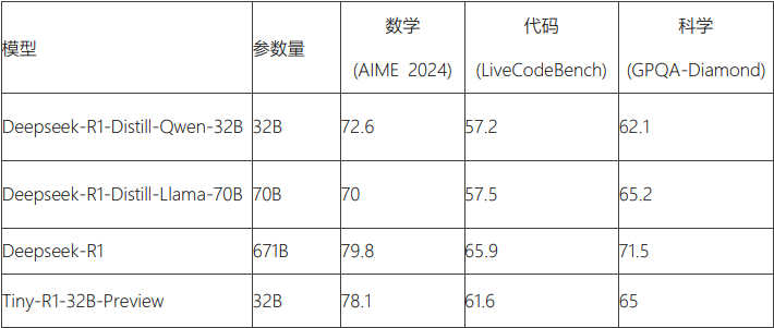 2025年2月24日,由北京大学计算机学院与360公司联合研发的32B模型Tiny-R1-32B-Preview正式亮相,仅以5%参数量,逼近DeepSeek-R1-671B的性能。该研究得到了国家自然科学基金委项目(U20A20179、62372009)的资助,得到了北大临港科创中心在算力资源方面的支持。