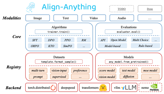 该框架是一个高度模块化、可扩展且易于使用的对齐训练和评估框架,支持文本、图片、视频和音频等多种模态的模型对齐微调。框架通过解耦模态与算法实现高度的模块化,例如,将多模态模型的加载实现和对齐算法如DPO\GRPO的实现进行分解组合。这种设计使得框架在模态扩展时能够复用相同的代码,便于用户为不同的任务修改和定制代码。