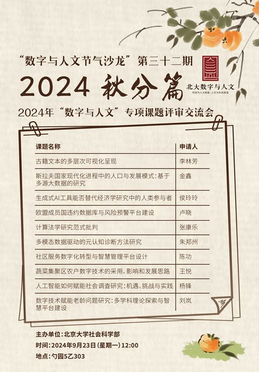 2024年9月23日中午,社会科学部在勺园五乙303会议室举行“数字与人文节气沙龙”秋分篇活动。本次活动是“节气沙龙”系列活动的第32期,主题是2024年“数字与人文”专项课题评审交流会。