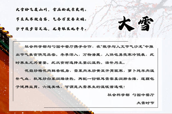 本次活动中,节气沙龙继续开通线上直播,实现线上线下双会场联动,面向校内各院系以及高校哲学社会科学实验室联盟单位开放直播。社会科学部继续与勺园中餐厅展开合作,应时而食,推出大雪节气特色美食供与会师生品尝。