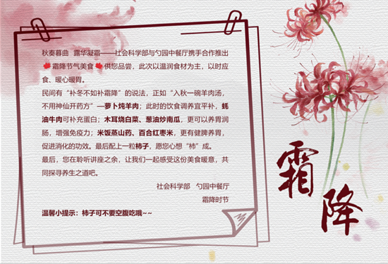 本次活动中,社会科学部继续与勺园中餐厅展开合作,应时而食,推出霜降节气特色美食供与会师生品尝。