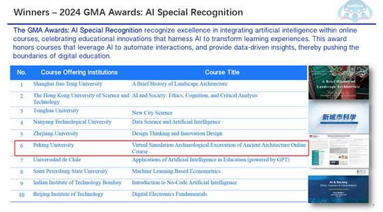 北京大学考古文博学院教师张剑葳代表获奖课程的团队成员(张剑葳、吴煜楠、尚劲宇、陈豪、王一臻、高勇)在线上参加颁奖环节并向全球观众展示此获奖课程。AI特别奖旨在表彰在在线集成人工智能方面有卓越表现的课程,鼓励利用人工智能改变学习体验的教育创新。这个奖项表彰利用人工智能交互并提供数据驱动的课程,从而推动拓展数字教育的边界。