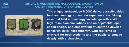 “虚拟仿真建筑考古发掘在线课程”分为田野考古基础理论教学、建筑考古遗址虚拟踏查实习、建筑考古遗址虚拟发掘3部分内容,通过数字孪生、虚拟仿真等手段实现交互式在线教学。课程结合教学资料知识库通过检索增强生成(RAG)技术制作了AI对话助教,便于解答学生和公众的各类问题,满足其个性化学习需求,探索性地拓展了数字教学的边界。
